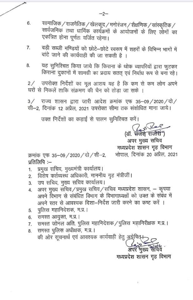 इस दौरान सामाजिक, राजनैतिक, खेलकूद, मनोरंजन, शैक्षणिक, सांस्कृतिक तथा धार्मिक कार्यक्रमों के आयोजन और लोगों के एकत्रित होने पर पूरी तरह प्रतिबंध रहेगा। सब्जी मंडियों को छोटे स्वरूप में शहरों के विभिन्न भागों में बांटा जा सकता है। निर्देश दिए गए हैं कि थोक किराना व्यापारियों द्वारा फुटकर किराना दुकानों को निर्बाध रूप से सामग्री प्रदान करते रहें। गाइडलाइन में कहा गया है कि इन निर्देशों का उद्देश्य है कि लोग कम से कम संख्या में घरों से निकलें ताकि कोरोना संक्रमण की चेन को तोड़ा जा सके।