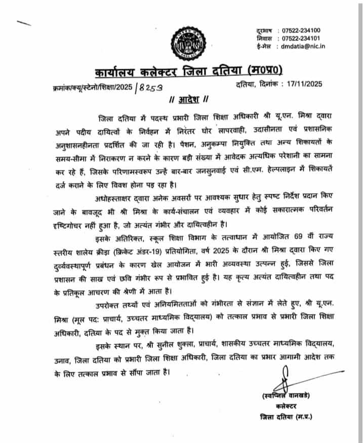 आदेश में कलेक्टर ने लिखा, इन सभी तथ्यों एवं अनियमितताओं को गंभीरता से संज्ञान में लेते हुए यूएन मिश्रा (मूल पद, प्राचार्य, उच्चतर माध्यमिक विद्यालय ) को तत्काल प्रभाव से प्रभारी जिला शिখা अधिकारी, दतिया के पद से मुक्त किया जाता है। उनके स्थान पर सुनील शुक्ला, प्राचार्य, शासकीय उच्चतर माध्यमिक विद्यालय, उनाव को प्रभारी जिला शिक्षा अधिकारी, का प्रभार आगामी आदेश तक के लिए सौंपा जाता है।