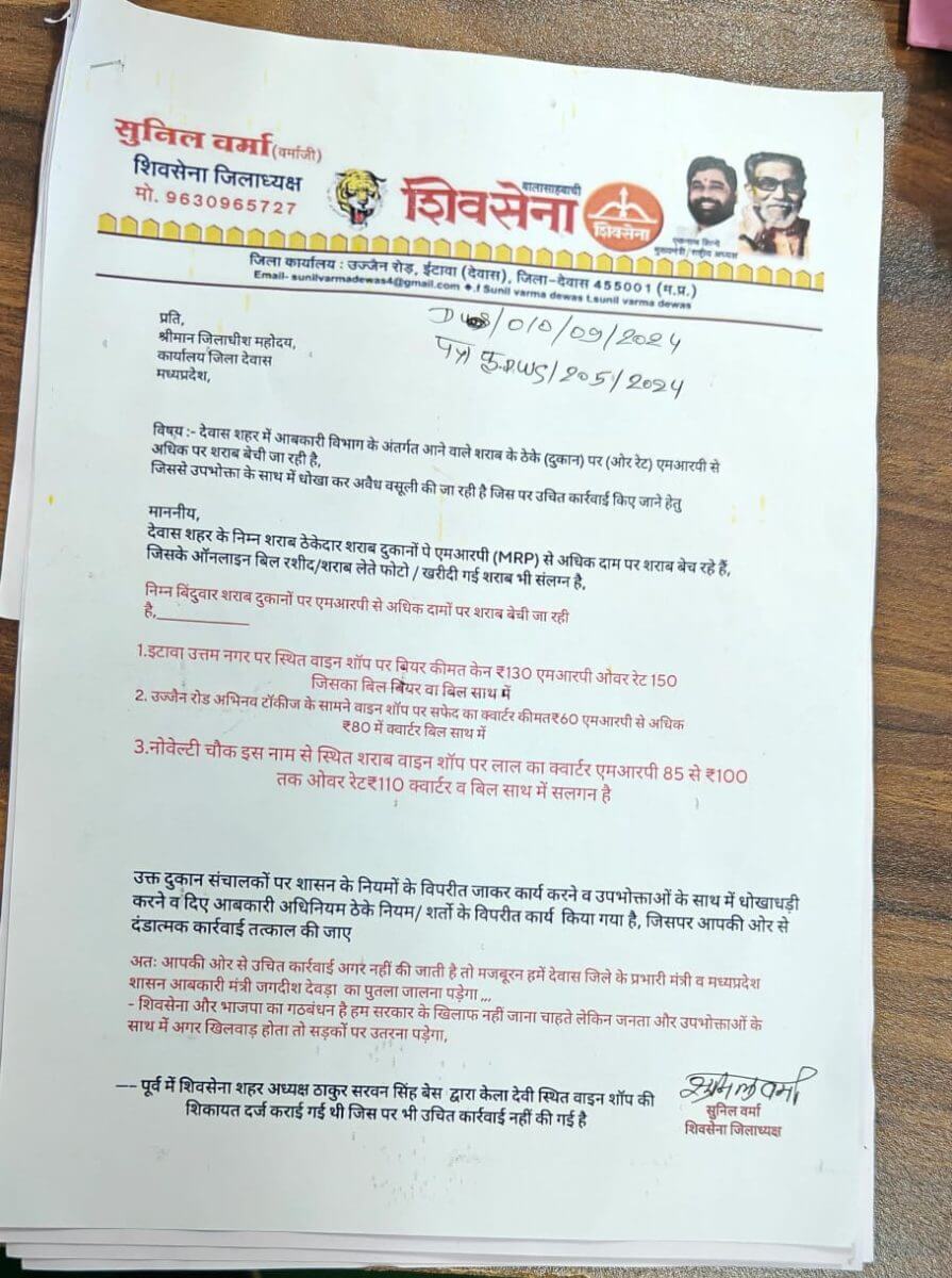 शिवसेना ने कलेक्टर से कहा कि इससे पहले शहर अध्यक्ष ठाकुर सरवन सिंह बेस द्वारा केला देवी स्थित वाइन शॉप की शिकायत दर्ज कराई गई थी, लेकिन उस पर कोई कार्रवाई नहीं हुई। पार्टी ने चेतावनी दी है कि यदि जल्द ही उचित कार्रवाई नहीं की गई, तो वे देवास जिले के प्रभारी मंत्री व मध्यप्रदेश शासन के आबकारी मंत्री जगदीश देवड़ा के खिलाफ प्रदर्शन करेंगे। उन्होंने कहा कि ‘शिवसेना और भाजपा का गठबंधन है और हम सरकार के खिलाफ नहीं जाना चाहते लेकिन जनता और उपभोक्ताओं के साथ में अगर खिलवाड़ होता तो सड़कों पर उतरना पड़ेगा’।