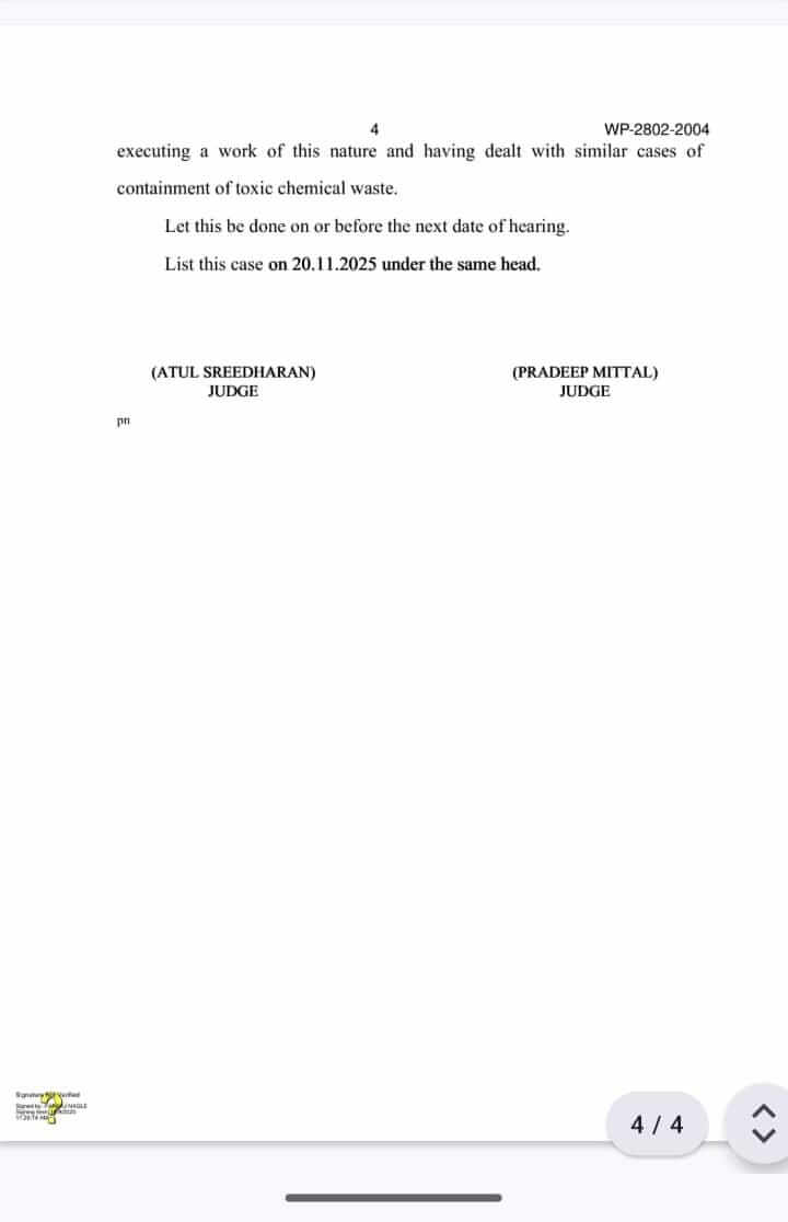 कोर्ट ने चेतावनी दी कि प्राकृतिक आपदा में राख रखने का ढांचा टूटने पर गंभीर परिणाम हो सकते हैं। याचिका में राख में पारे की मात्रा तय सीमा से अधिक होने की बात भी सामने आई है। हाई कोर्ट सरकार के प्रस्तुत एनिमेटेड वीडियो से संतुष्ट नहीं हुआ। इस मामले की अगली सुनवाई 20 नवंबर को होगी। पीथमपुर बचाव समिति ने कोर्ट के फैसले को जनता की जीत बताया है।