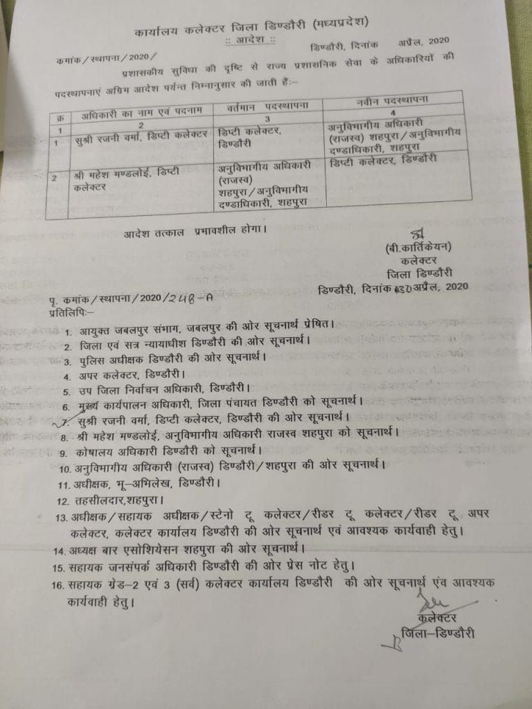 डिंडोरी कलेक्टर बी कार्तिकेयन ने बड़ी कार्रवाई करते हुए शहपुरा एसडीएम महेश मंडलोई को हटा दिया है। उनके स्थान पर डिप्टी कलेक्टर रजनी वर्मा होंगी को शहपुरा एसडीएम बनाया गया है। बता दें कि पूर्व एसडीएम मंडलोई पर लगातार रुपयों के लेनदेन के आरोप लग रहे थे।