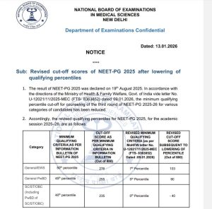According to an official notice released by NBEMS, the decision was implemented based on instructions from the Ministry of Health and Family Welfare (MoHFW) dated January 9, 2026. The board has clarified that this revision only pertains to eligibility for counselling and will not alter the original merit list or ranks of the NEET-PG 2025 examination.