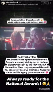 दरअसल हाल ही में अभिनेता राज जुत्शी की भतीजी संक्षिता जुत्शी ने इंस्टाग्राम स्टोरी पर धुरंधर 2 को लेकर अपनी खुशी जाहिर की। उन्होंने अपने चाचा राज जुत्शी की एक्टिंग की भी तारीफ की और उन्हें स्क्रीन पर देखकर गर्व महसूस होने की बात कही। संक्षिता ने लिखा कि किसी भी फिल्म का सीक्वल बनाना आसान नहीं होता, क्योंकि पहली फिल्म की सफलता के बाद दर्शकों की उम्मीदें बहुत बढ़ जाती हैं। लेकिन इस फिल्म ने उन उम्मीदों को पूरा करने के साथ-साथ उन्हें पार भी कर लिया। उन्होंने यह भी लिखा कि इस शानदार काम के लिए आदित्य धर राष्ट्रीय पुरस्कार के हकदार हैं।