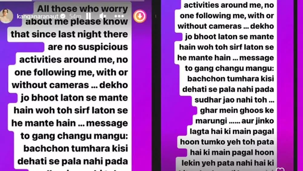 कंगना ने अपने इंस्टाग्राम पेज पर एक स्टोरी शेयर की है। जिसमें उन्होंने धमकी भरे लहजे में किसी जोड़े को चेतावनी दी है। ‘जो भी लोग मेरे लिए परेशान थे उन्हें बता दूं कि, बीती रात से मेरे आसपास ऐसी कोई संदिग्ध गतिविधि नहीं हुई है। कोई मुझे फॉलो नहीं कर रहा न तो कैमरे के साथ और न ही बिना कैमरे के। देखो, जो भूत लातों से मानते हैं वो तो सिर्फ लातों से ही मानते हैं। यह मैसेज चंगू मंगू गैंग के लिए है- बच्चों, तुम्हारा किसी देहाती से पाला नहीं पड़ा है, सुधर जाओ नहीं तो घर में घुसकर मारूंगी… और जिनको लगता है कि मैं पागल हूं तुमको ये तो पता है कि मैं पागल हूं लेकिन ये नहीं पता कि कितनी बड़ी वाली हूं।’
