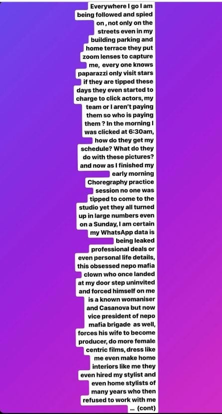 दरअसल, कुछ दिन पहले ही अभिनेत्री ने इंस्टा पोस्ट के माध्यम से जानकारी साझा की थी कि कोई उनका पीछा कर रहा हैं। वह जहां जाती है उन पर नजर रखी जा रही है। जिसे शेयर करते हुए उन्होंने लिखा था कि, ‘पापाराजी को स्टार्स तभी मिलते हैं जब उन्हें इस बात जानकारी दी जाती है और वे फोटोज भी तभी लेते हैं जब उन्हें पैसे इसके मिलते हैं। मैं या मेरी टीम उन्हें पैसे नहीं देते तो कौन दे रहा है? ये ऑब्सेस्ड नेपो माफिया जो एक बार बिन बुलाए मेरे दरवाजे तक पहुंच गया था, जो एक वुमनाइजर के तौर पर फेमस रहा है, उसके कई महिलाओं से रिलेशन रहे और अब माफिया ब्रिगेट का वाइस प्रेसिडेंट है।’