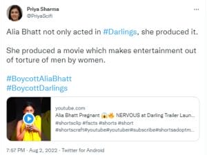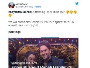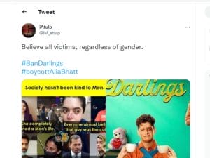 डार्लिंग्स’ जैसी गलतफहमी वाली फिल्म बनाने के लिए सभी को #BoycottAliaBhatt करना चाहिए। बॉलीवुड के लिए पुरुषों पर घरेलू हिंसा मजाक का विषय है। दयनीय। वहीं एक अन्य यूज़र ने लिखा हम पुरुषों के खिलाफ घरेलू हिंसा को बर्दाश्त नहीं करेंगे। पुरुषों के खिलाफ डीवी कोई मजाक नहीं है। इसके अलावा एक ने लिखा #BoycottAliaBhatt जो पुरुषों पर DV का प्रचार कर रहे हैं। सोचिए अगर जेंडर बदल गया होता तो।