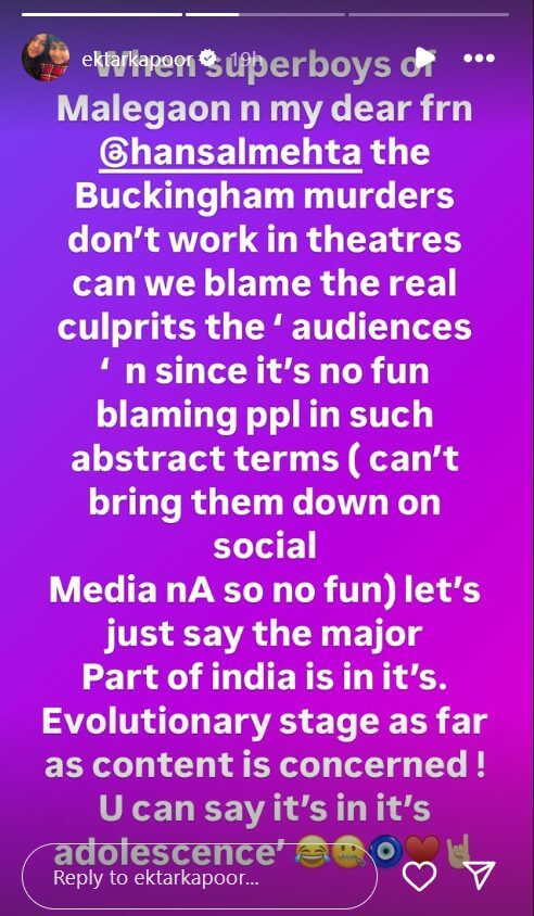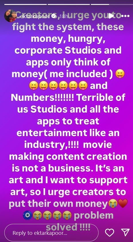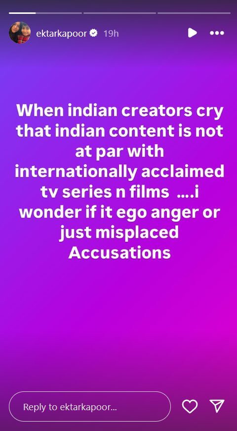 एकता कपूर ने अपने सोशल मीडिया अकाउंट पर स्टोरी शेयर की। जिसमें उन्होंने लिखा, “पैसों से ज्यादा अगर आर्ट पर फोकस किया जाए, तो हमारा सिनेमा भी किसी हॉलीवुड सीरीज से कम नहीं।” आगे उन्होंने लिखा, “जब इंडियन क्रिएटर इस बात पर रोते हैं कि इंडियन कंटेंट में अब दम नहीं रहा है, तो उन्हें बहुत बुरा लगता है। वे लोग इंटरनेशनल टीवी सीरीज और फिल्मों की तारीफ करते हैं। अगर वह लोग ऐसा करते हैं, तो क्या यह उनका एक है या गुस्सा। कहा जाए कि वह अपने दिमाग में गलत धारणा हमारे सिनेमा को लेकर बनने जा रहे हैं।”