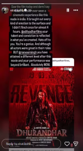 सोशल मीडिया हैंडल इंस्टाग्राम पर एक्ट्रेस को आदित्य धर और फिल्म के कलाकार तारीफ करते हुए देखा गया। उन्होंने स्टोरी पर एक नोट लिखा है और कहां कि “आपने क्या शानदार फिल्म बनाई है आदित्य धर, लगभग 4 घंटे लंबे फिल्म बनाना बहुत दृढ़ विश्वास की बात है। ये बहुत बारीकी से क्राफ्ट की गई है। शुरुआत से लेकर अंत तक यह आपका ध्यान खींचती है। आप बहुत ओरिजिनल और आत्मविश्वास से भरे फिल्मकार हैं।”