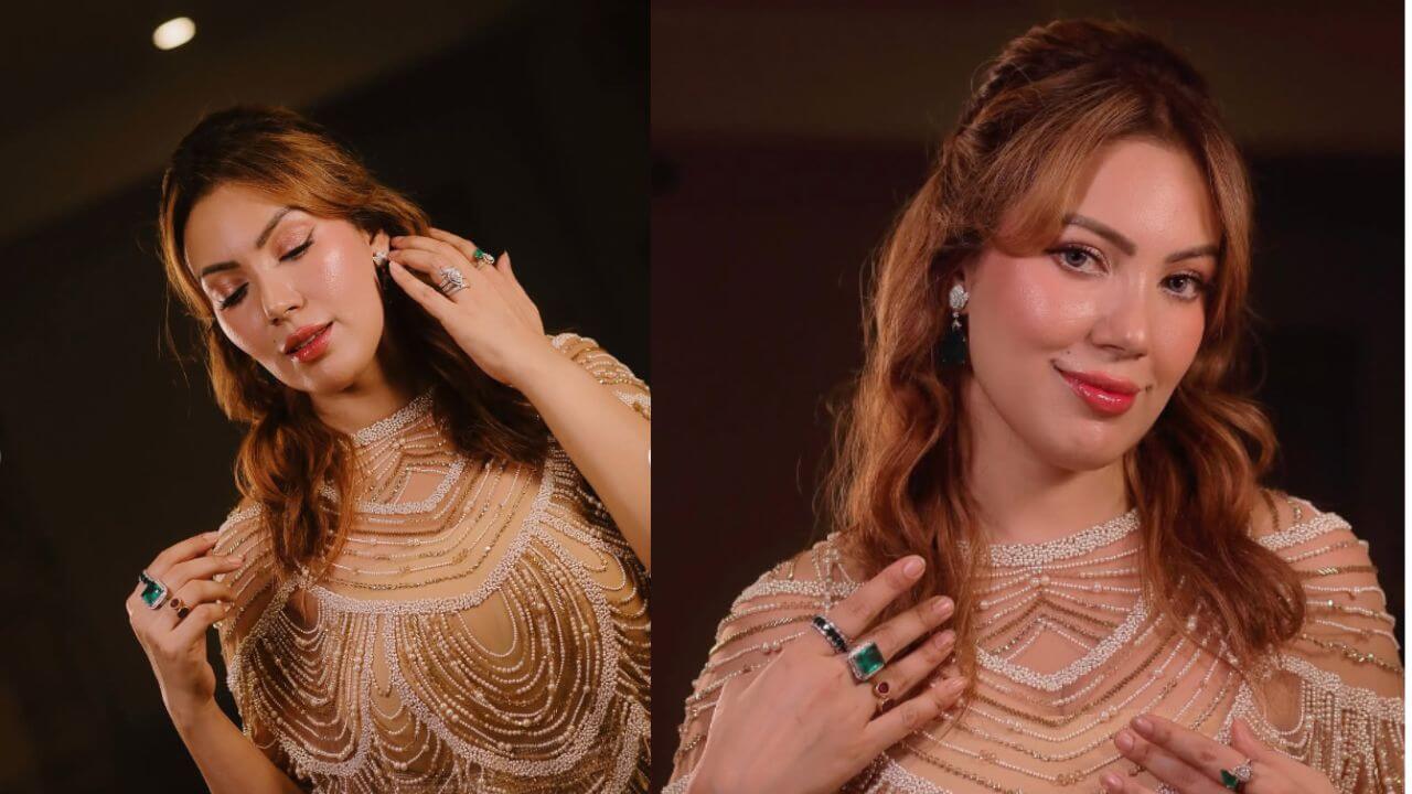 उन्होंने गोल्डन बॉडीकॉन ड्रेस के साथ एमराल्ड ग्रीन ईयररिंग्स पहने हैं, जो उनके आउटफ़िट में एक ख़ूबसूरत कॉन्ट्रास्ट जोड़ रहे हैं। वही उनके हाथों में पहनी एमराल्ड ग्रीन स्टाइलिश रिंग उनके ओवरऑल लुक को और भी ज़्यादा ग्रेस फूल बना रही है।