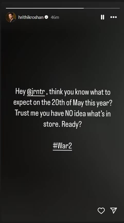 ऋतिक रोशन ने अपनी इंस्टाग्राम स्टोरी में साउथ एक्टर एनटीआर को मेंशन करते हुए लिखा, “एनटीआर तुम जानते हो कि इस साल 20 मई को क्या होने वाला है। मेरा यकीन मानो इसकी तुमने उम्मीद भी नहीं की होगी।”