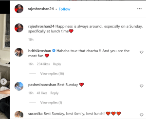 तस्वीर को शेयर करते हुए म्यूजिक कंपोजर राजेश रोशन ने कैप्शन में लिखा “खुशियां हमेशा हमारे आसपास होती हैं, और खासकर कि संडे पर और लंच टाइम पर” उन्होंने इसी के साथ साउथ इंडियन लंच का फोटो भी शेयर किया है। जिसमें स्वादिष्ट साउथ इंडियन पकवान केले के पत्ते पर परोसा परोसे हुए दिखे। उनके इस पोस्ट पर ऋतिक रोशन के साथ सबा आजाद ने भी कमेंट किया।