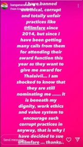 अपने इंस्टाग्राम हैंडल से एक स्टोरी शेयर करते हुए कंगना ने लिखा, “मैंने साल 2014 से ही फिल्मफेयर को बैन कर दिया है। यह अनैतिक, भ्रष्ट और पूरी तरह से अनुचित है और वो इसका हिस्सा नहीं बनेंगी। मुझे इस साल फिल्मफेयर पुरस्कार समारोह में शामिल होने के लिए कई फोन आ रहे हैं, क्योंकि वे उन्हें ‘थलाइवी’ के लिए अवॉर्ड देना चाहते हैं। मैं यह जानकर हैरान हूं कि वे अब भी मुझे नॉमिनेट कर रहे हैं। किसी भी तरह से इस तरह की भ्रष्ट प्रथाओं को प्रोत्साहित करना मेरी गरिमा, कार्य नैतिकता और मूल्य प्रणाली के खिलाफ है। इसलिए मैंने फिल्मफेयर पर मुकदमा करने का फैसला किया है … धन्यवाद।”
