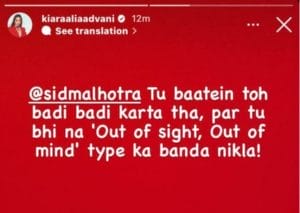 हालांकि, फिल्म के अलावा बात करें तो बी-टाउन में सिद्धार्थ-कियारा के प्यार की चर्चाएं चारों तरफ है। बेशक, अभी तक इसकी आधिकारिक पुष्टि नहीं हुई है। इस बीच फिल्म का एक साल पूरा होने की खुशी में कियारा ने अपने इंस्टाग्राम से पोस्ट जारी किया है। इसी दौरान उन्होंने अपने रुमर्ड बॉयफ्रेंड सिद्धार्थ के लिए एक स्टोरी डाली, जहां लिखा,”सिद्धार्थ मल्होत्रा तू बातें तो बड़ी बड़ी करता है कि, लेकिन तू भी ‘आउट ऑफ विजन, आउट ऑफ माइंड’ टाइप का बंदा निकला।”