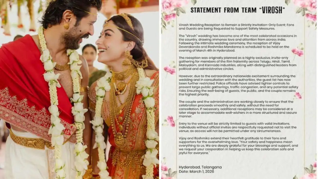 “हम अपने सभी फैंस के प्यार और शुभकामनाओं के लिए हमेशा आभारी रहेंगे। हम आपसे विनम्रतापूर्वक अनुरोध करते हैं कि व्यवस्थाओं में सहयोग करें और औपचारिक निमंत्रण के बिना कार्यक्रम स्थल पर इकट्ठा न हों।” — विजय देवरकोंडा और रश्मिका मंदाना