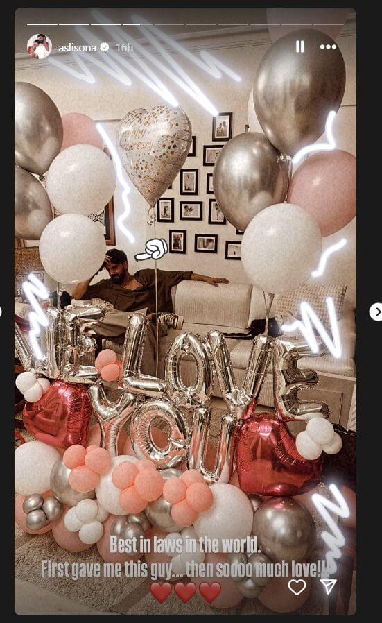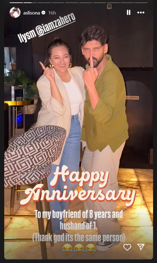 सोनाक्षी और जाहिर की वेडिंग एनिवर्सरी पर एक्ट्रेस के सास-ससुर ने उन्हें सरप्राइज दिया है। जिसकी तस्वीर भी एक्ट्रेस ने अपने सोशल मीडिया अकाउंट इंस्टाग्राम पर शेयर की है, जिसमें कोच पर जाहिर बैठे हुए हैं। इसके कैप्शन में सोनाक्षी ने लिखा, “दुनिया में सबसे अच्छे ससुराल वाले, पहले मुझे यह इंसान दिया और फिर इतना सारा प्यार।”