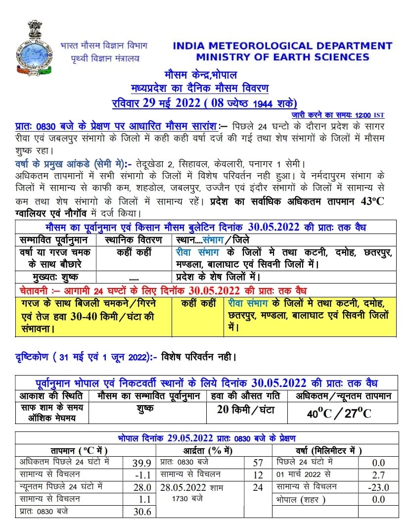एमपी मौसम विभाग (MP Weather Today ) के अनुसार, पिछले 24 घंटे में ग्वालियर और नौगांव में 43 डिग्री सेल्सियस तापमान दर्ज किया गया। वही जबलपुर, रीवा और साागर संभागो के जिलों में हल्की बारिश हुई । पिछले 24 घंटों के दौरान रविवार सुबह साढ़े आठ बजे तक जबलपुर में 5.8, दमोह में एक मिलीमीटर बारिश हुई। आज रविवार 29 मई 2022 को 10 जिलों में गरज चमक के साथ बौछार के आसार है और गरज के साथ बिजली चमकने और तेज हवा 30/40 किमी प्रति घंटा चल सकती है।