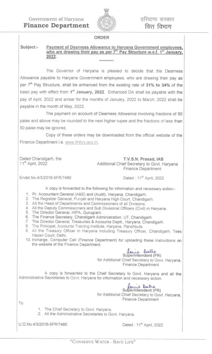 इसके अलावा कर्मचारियों को जनवरी 2022 से मार्च 2022 कुल तीन महीने का एरियर्स (arrears) भी अप्रैल महीने के वेतन के साथ भुगतान किया जाएगा। बता दें कि इससे पहले हरियाणा के कर्मचारियों को 31 फीसद की दर से डीए का भुगतान किया जा रहा था।