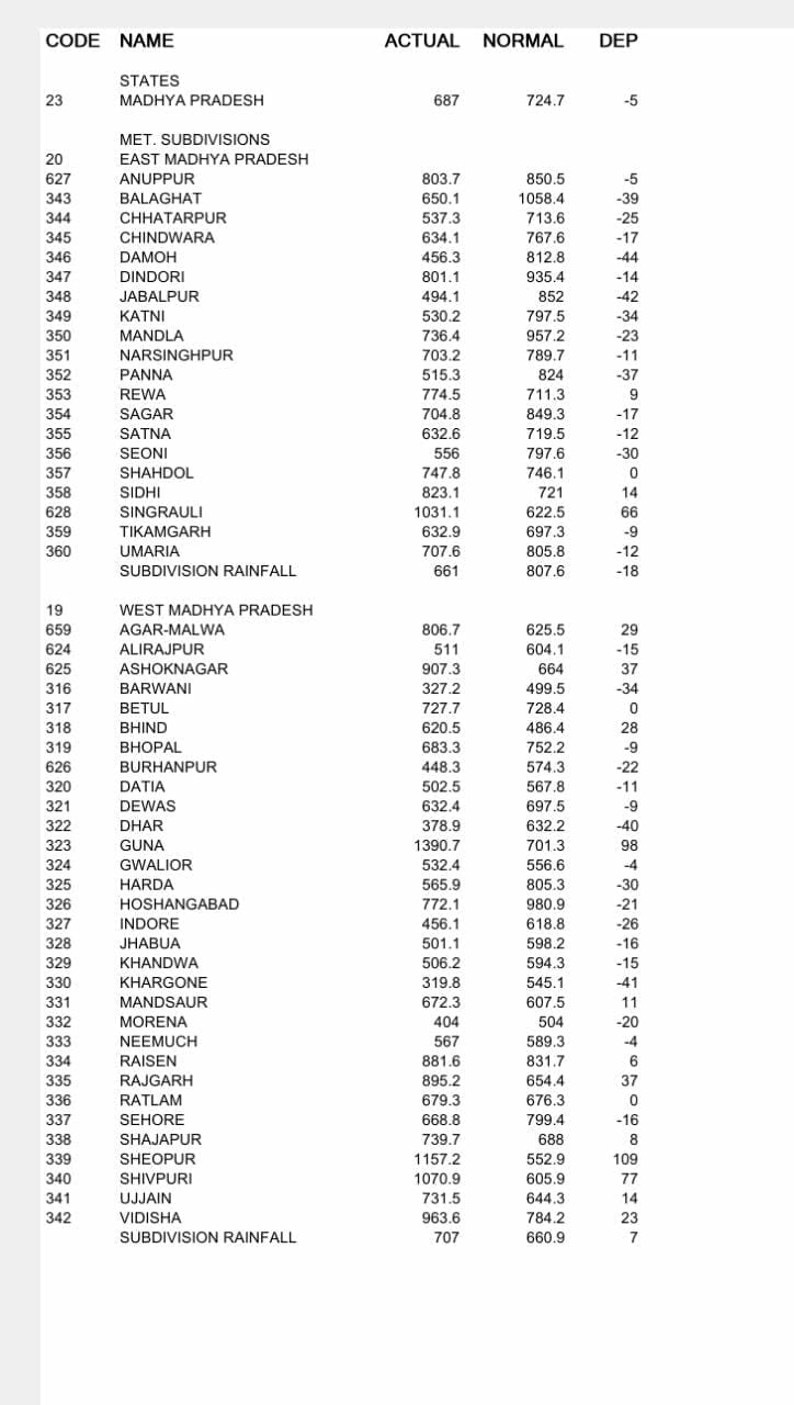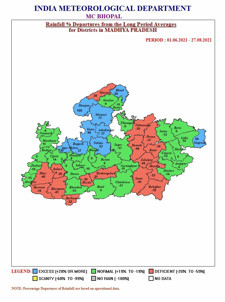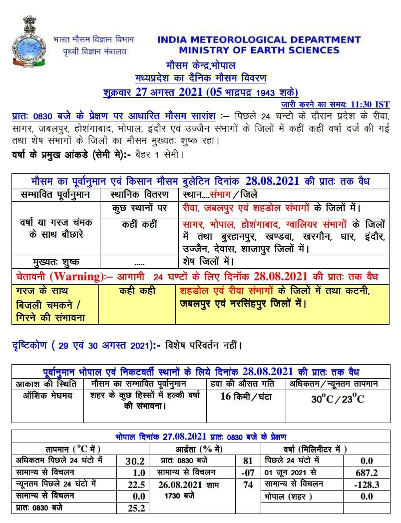 मौसम विभाग (MP Weather Department) के अनुसार, 27 से 28 अगस्त के बीच बंगाल की खाड़ी में कम दबाव का क्षेत्र बनने की संभावना है, जिससे मानसून (Monsoon) ट्रफ लाइन सामान्य स्थिति में आएगी और अरब सागर से भी नमी आ रही है, ऐसे में 30 अगस्त से मानसून सक्रिय होने के साथ ही एक बार फिर झमाझम के आसार बन रहे है। मौसम विभाग की मानें तो 29 अगस्त को जबलपुर, मंडला सहित पूर्वी मध्य प्रदेश के कई शहरों में भारी बारिश हो सकती है।