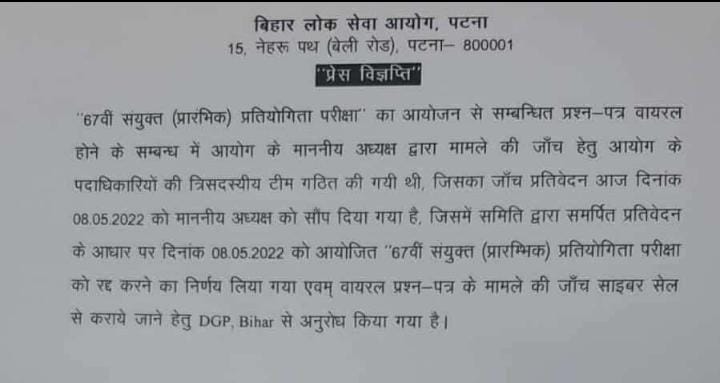 एक आधिकारिक नोटिस में, BPSC ने साझा किया है कि परीक्षा आज 8 मई, 2022 के लिए निर्धारित की गई थी। हालांकि प्रश्न पत्र ऑनलाइन वायरल हो गया। जब इसकी खबर मिली तो आयोग ने जांच शुरू कर दी। स्थिति को समझने के आधार पर परीक्षा रद्द करने का निर्णय लिया गया। नीचे आधिकारिक नोटिस देखें।