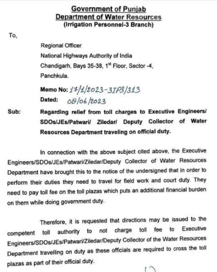 राज्य सरकार की तरफ से जारी किए गए आदेश में एग्जीक्यूटिव इंजीनियर, एसडीओ, जेई, पटवारी, जिलेदार, डिप्टी कलेक्टर को अब टोल टैक्स नहीं देना होगा। ड्यूटी के दौरान इन सभी को टोल टैक्स से मुक्त किया गया है। ड्यूटी के दौरान इन सभी को नेशनल हाईवे पर पड़ने वाले सभी प्रकार के टोल टैक्स से मुक्त कर दिया है। प्रिंसिपल सेक्रेटरी वाटर रिसोर्स ने इस बारे में पंचकूला में नेशनल हाईवे अथॉरिटी आफ इंडिया के रिजनल ऑफिस को भी जानकारी है। पत्र के माध्यम से उन सभी अधिकारियों और कर्मचारियों को भी सूचित किया गया है जिनको इसका लाभ मिलने वाला है।