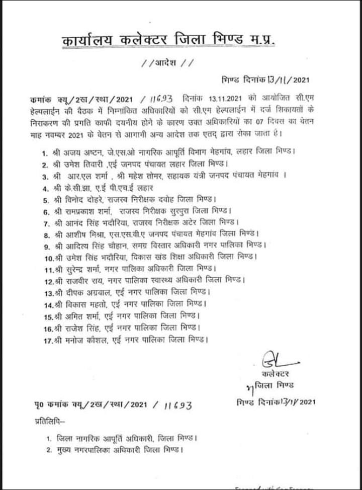 दरअसल सीएम हेल्पलाइन (CM Helpline) की समीक्षा बैठक में कलेक्टर ने 17 अधिकारियों के वेतन रोकने के आदेश जारी किए है। दरअसल शनिवार को आयोजित सीएम हेल्पलाइन की समीक्षा बैठक के दौरान भिंड कलेक्टर (Bhind Collector) ने सीएम हेल्पलाइन में शिकायतों के निराकरण की धीमी गति को देखते हुए अधिकारियों पर सख्त कार्रवाई की। इस दौरान निराकरण की प्रगति को काफी देनी है बताते हुए कलेक्टर ने अधिकारियों के साथ दिन के वेतन को आगामी अन्य आदेश तक रोकने के आदेश जारी किए हैं।