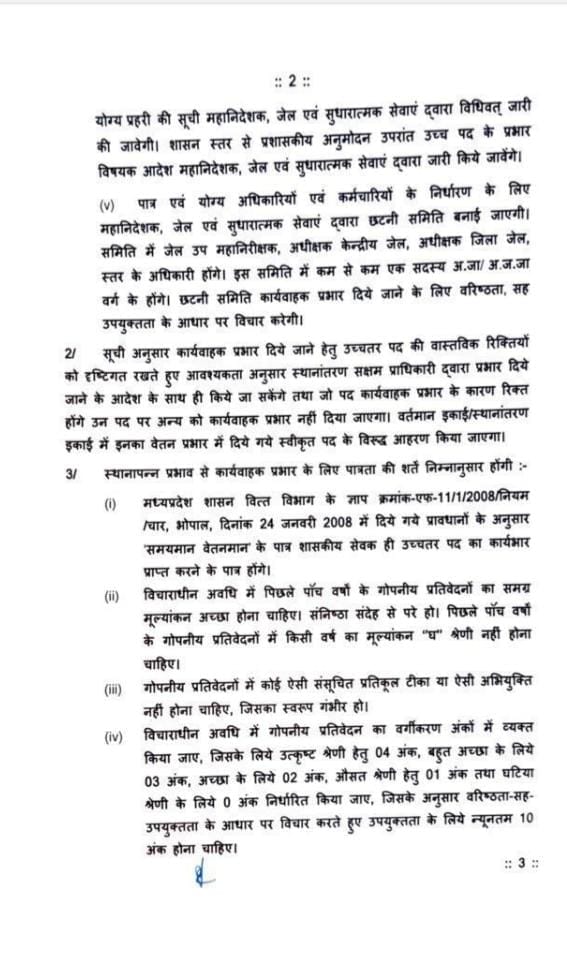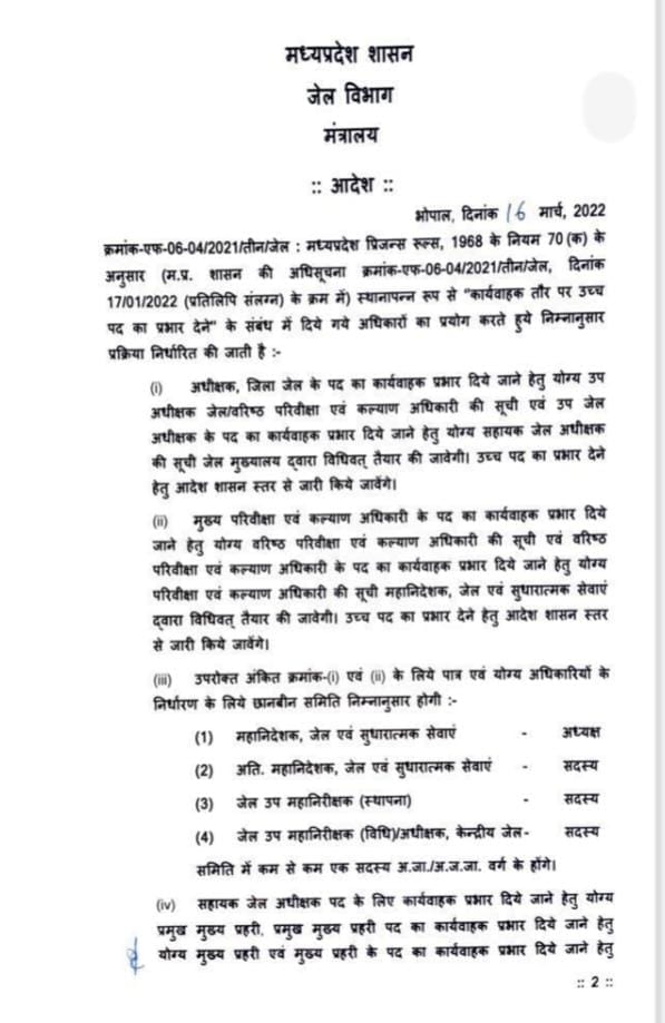 भोपाल, डेस्क रिपोर्ट। मध्य प्रदेश के अधिकारी कर्मचारियों (MP Employees) के लिए बड़ी खबर हैं। दरअसल अब जल्द ही इन कर्मचारियों को उच्च पद का प्रभार (high post charge) दिया जाएगा। इसके लिए आदेश जारी कर दिए गए हैं। राज्य शासन द्वारा आदेश जारी किये गए हैं। जारी आदेश के मुताबिक जल्दी ही जेल विभाग (Jail Department) के अधिकारी कर्मचारियों को कार्यवाहक तौर पर उच्च पद का प्रभार दिया जाएगा।