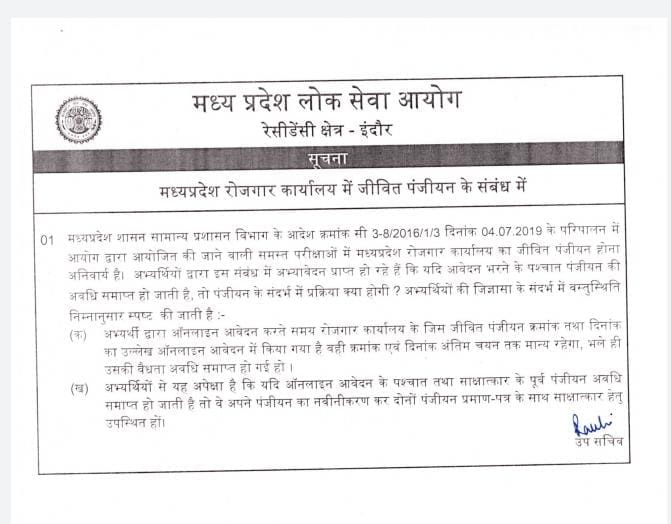 ऐसी स्थिति में MPPSC की तरफ से जारी सूचना में बताया गया है कि यदि परीक्षाओं के लिए आवेदन करने के बाद यदि उम्मीदवारों के रोजगार पंजीयन की अवधि समाप्त हो जाता है। ऐसे में उम्मीदवारों को क्या करना चाहिए। दरअसल जारी सूचना के मुताबिक उम्मीदवारों को आवेदन करते समय रोजगार कार्यालय के जीवित पंजीयन क्रमांक और दिन का उल्लेख ऑनलाइन आवेदन में किया गया है। वही क्रमांक और अंतिम चयन तक मानी रहेगा भले ही उसकी वैधता अवधि पूर्ण रूप से समाप्त हो जाए।