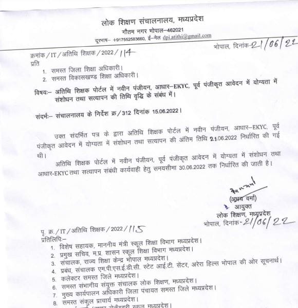 अभय वर्मा आयुक्त लोक शिक्षण संचालनालय मध्यप्रदेश द्वारा आदेश कुमार 114 दिनांक 21 जून 2022 के द्वारा मध्य प्रदेश के सभी जिला शिक्षा अधिकारियों एवं विकास खंड शिक्षा अधिकारियों को सूचित किया गया है कि अतिथि शिक्षक प्रबंधन पोर्टल में नवीन पंजीयन, आधार eKYC, पहले से रजिस्टर्ड अतिथि शिक्षकों की योग्यता में संशोधन तथा सत्यापन की लास्ट डेट 21 जून 2022 निर्धारित की गई थी। उपरोक्त प्रक्रिया के लिए समय सीमा बढ़ाकर 30 जून 2022 निर्धारित की जाती है।