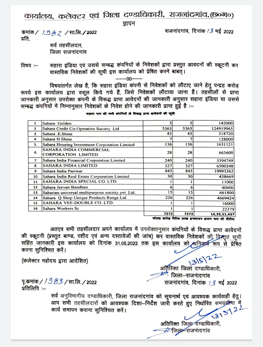 सहारा इंडिया कंपनी की विभिन्न कोऑपरेटिव सोसायटीयो में फसे छत्तीसगढ के राजनांदगांव जिले के हजारों निवेशकों के लगभग 15 करोङ रू वापस दिलाने के लिए जिला प्रशासन ने बड़ी प्रभावी कार्रवाई की है। दरअसल विभिन्न कोऑपरेटिव सोसायटीयो में निवेशकों के पैसे तो कंपनी ने निवेश करा लिए लेकिन परिपक्वता अवधि पूरी होने के बाद भी उन्हें वापस नहीं किया गया।
