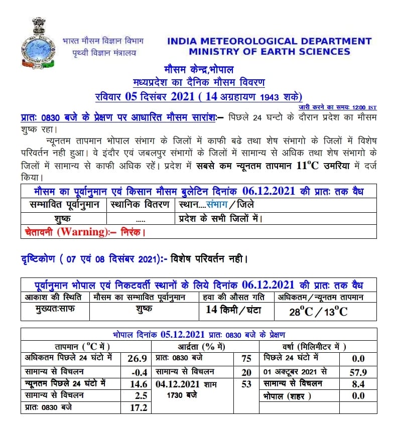 भोपाल, डेस्क रिपोर्ट। मध्य प्रदेश का मौसम (MP Weather Update) एक बार फिर बदलने वाला है।बंगाल की खाड़ी में एक और वेदर सिस्टम बनने जा रहा है, जिसके चलते दो तीन दिनों बाद फिर बादल छा सकते है और जबलपुर समेत कई जिलों में बूंदाबांदी होने के आसार है। एमपी मौसम विभाग (MP Weather Department) ने आज रविवार 5 दिसंबर 2021 को कहीं भी बारिश की संभावना नहीं जताई है, सभी जिले शुष्क रहेंगे।शनिवार को सबसे न्यूनतम तापमान उमरिया में 11 डिग्री सेल्सियस दर्ज किया गया है।