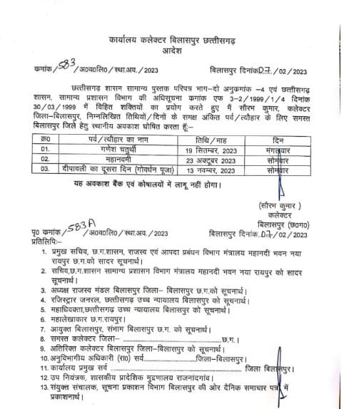 दरअसल, 2023 के लिए बिलासपुर जिले में कलेक्टर सौरभ कुमार ने स्थानीय अवकाश घोषित कर दिये हैं। इस साल अलग-अलग त्योहार पर स्थानीय अवकाश को लेकर लिस्ट जारी हुई है। जारी आदेश के मुताबिक गणेश चतुर्थी 19 सितम्बर 2023 दिन मंगलवार, दशहरा 23 अक्टूबर 2023 दिन बुधवार, गोवर्धन पूजा (दीपावली के दूसरे दिन) 13 नवम्बर 2023 दिन मंगलवार को स्थानीय अवकाश रहेगा। बिलासपुर की तरफ अलग अलग जिलों के कलेक्टरों द्वारा भी कर्मचारियों के लिए अवकाश घोषित किए गए है।