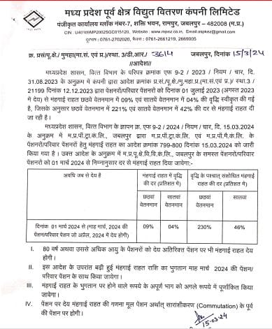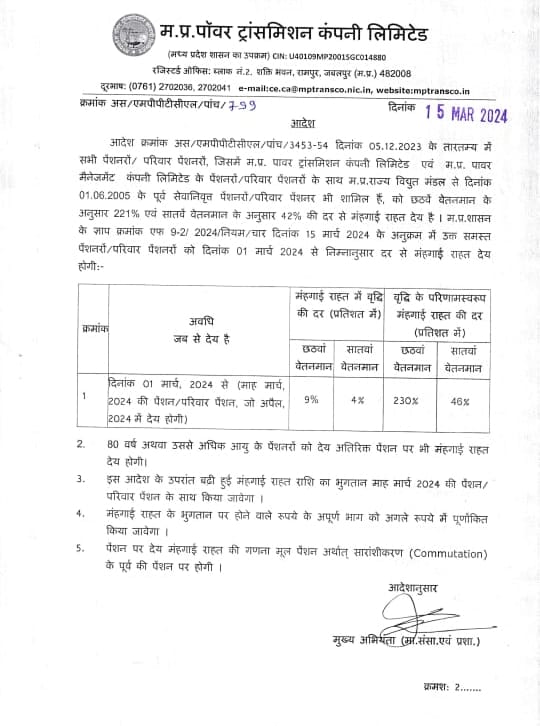 - मप्र पावर ट्रांसमिशन कंपनी लिमिटेड द्वारा पेंशनरों एवं परिवार पेंशनरों की महंगाई राहत में भी वृद्धि कर दी गई है। मप्र शासन के 15 मार्च 2024 को जारी आदेश के अनुक्रम में समस्त विद्युत पेंशनरों एवं परिवार पेंशनरों को दिनांक 01 मार्च 2024 से छठवें वेतनमान के अनुसार 9% के वृद्धि के बाद 230% एवं 7वें वेतनमान के अनुसार 4% की वृद्धि के बाद 46% की दर से DRअप्रैल 2024 से देय होगी। fइसमें मप्र राज्य विद्युत मंडल से दिनांक 01.06.2005 के पूर्व सेवानिवृत्त पेंशनरों एवं परिवार पेंशनर भी शामिल हैं, को छठवें वेतनमान के अनुसार 221% एवं 7वें वेतनमान के अनुसार 42% की दर से मंहगाई राहत देय है।