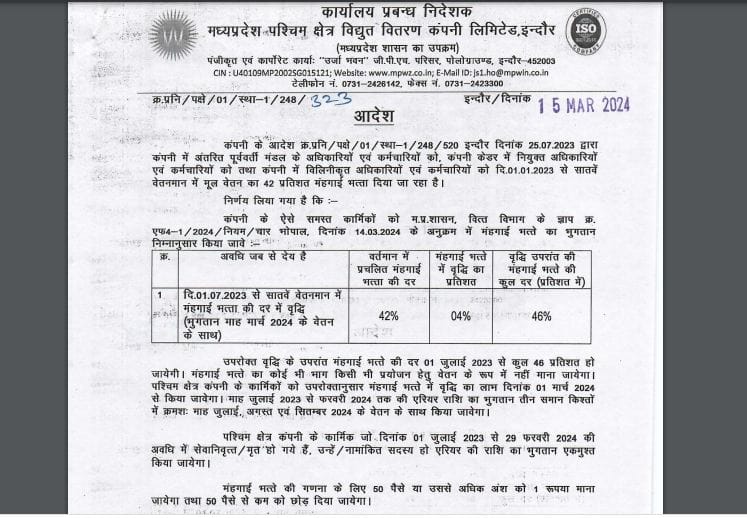 मध्य प्रदेश की पूर्व क्षेत्र विद्युत वितरण कंपनी में कार्यरत नियमित अधिकारियों एवं कर्मचारियों के महंगाई भत्ते में भी 4 % की वृद्धि की गई है, जिसके बाद कर्मचारियों अधिकारियों का कुल डीए 42% से बढ़कर 46% हो गया है। जारी आदेश के अनुसार 7वें वेतनमान में कार्मिकों को वर्तमान में मूल वेतन पर 1 जुलाई 2023 से 4% DA देय होगा। ।महंगाई भत्ते में हुई वृद्धि का लाभ एक मार्च 2024 (भुगतान माह अप्रैल 2024) से किया जाएगा। एक जुलाई 2023 से 29 फरवरी 2024 तक की एरियर राशि का भुगतान 3 समान किश्तों में क्रमश: माह जुलाई, अगस्त, सिंतबर 2024 में दिया जाएगा।