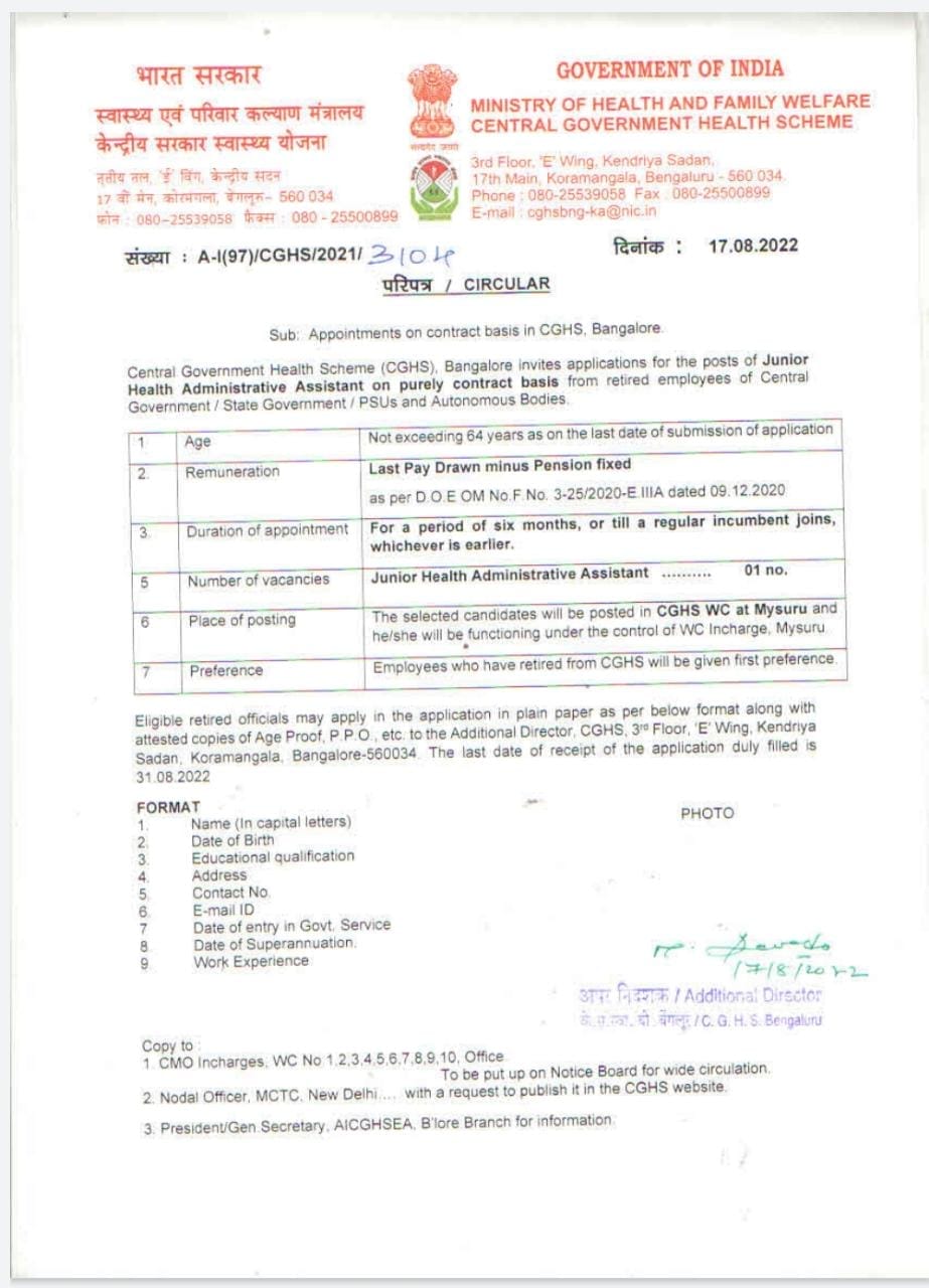 ऐसे ही रिटायर्ड कर्मचारियों के लिए केंद्र सरकार ने सेंट्रल गवर्नमेंट हेल्थ स्कीम (CGHS) के अंतर्गत कॉन्ट्रैक्ट बेसिस (CONTRACT BASIS) पर नियुक्तियां निकाली है। CGHS बेंगलुरु में सरकार में जूनियर हेल्थ एडमिनिस्ट्रेटिव असिस्टेंट (JUNIOR HEALTH ADMINISTRATIVE ASSISTANT) की पोस्ट के लिए सर्कुलर जारी किया है।सर्कुलर में सरकार ने उन सभी अधिकारियों से आवेदन भेजने के लिए कहा है जो कि किसी केंद्रीय सरकार, राज्य सरकार, PSU या स्वशासी संस्था के अंतर्गत काम कर चुके हैं। सर्कुलर में यह भी साफ तौर पर स्पष्ट किया गया है। ऐसे कर्मचारी जो सीजीएचएस से रिटायर्ड है उन्हें महत्ता (preference) दी जाएगी। चुने हुए व्यक्ति को कम से कम 6 महीने के लिए कॉन्ट्रैक्ट पर रखा जाएगा। यह अवधि तब तक बढ़ाई जा सकती है जब तक पोस्ट पर कोई नियमित व्यक्ति नहीं आ जाता।