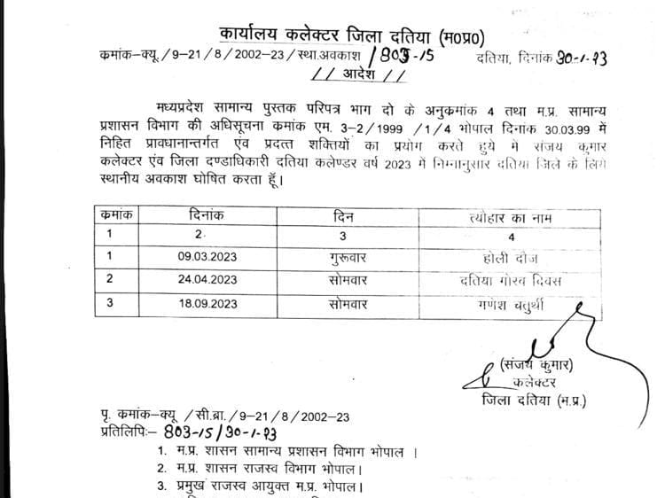 मामले में दतिया के कलेक्टर संजय कुमार द्वारा आदेश जारी किया गया है। 30 जनवरी को जारी हुए आदेश के तहत जिले में 3 दिन के स्थानीय अवकाश की घोषणा की गई है। मध्यप्रदेश सामान्य पुस्तक परिपत्र भाग 2 के अनुक्रमांक चार और सामान्य प्रशासन विभाग की अधिसूचना के प्रावधान के तहत जिला दंडाधिकारी दतिया कलेक्टर संजय कुमार ने वर्ष 2023 के लिए 3 स्थानीय अवकाश की घोषणा की है।