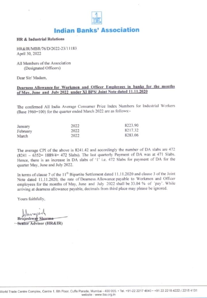 11वें द्विपक्षीय समझौता दिनांक 11.11.2020 के खंड 7 और संयुक्त नोट दिनांक 11.11.2020 के खंड 3 के अनुसार, मई, जून और जुलाई 2022 के महीनों के लिए कर्मचारियों और अधिकारी कर्मचारियों को देय महंगाई भत्ते की दर वेतन’ का 33.04 % होगी। वहीं जारी आदेश के मुताबिक देय महंगाई भत्ते की गणना करते समय, तीसरे स्थान से दशमलव को अनदेखा किए जाने के निर्देश दिए गए हैं।