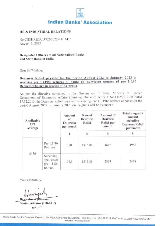 बैंकों के 1.1.1986 से पहले के सेवानिवृत्त लोगों को अगस्त 2022 से जनवरी 2023 की अवधि के लिए देय महंगाई राहत और अनुग्रह राशि के आदेश जारी कर दिए हैं इन आंकड़ों के जरिये ही DR और अनुग्रह राशि जोड़कर उन्हें राशि खाते में भेजी जाएगी यह आदेश बैंकों के 1.1.1986 से पहले के सेवानिवृत्त लोगों और 1.1.86 के पूर्व सेवानिवृत्त लोगों के जीवित पति या पत्नी जो अनुग्रह राशि प्राप्त कर रहे हैं, उनपर लागू होगी।