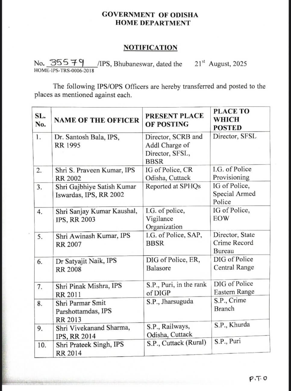 - एस. प्रवीण कुमार : पुलिस महानिरीक्षक, सीआर, ओडिशा, कटक से पुलिस महानिरीक्षक, प्रोविजनिंग