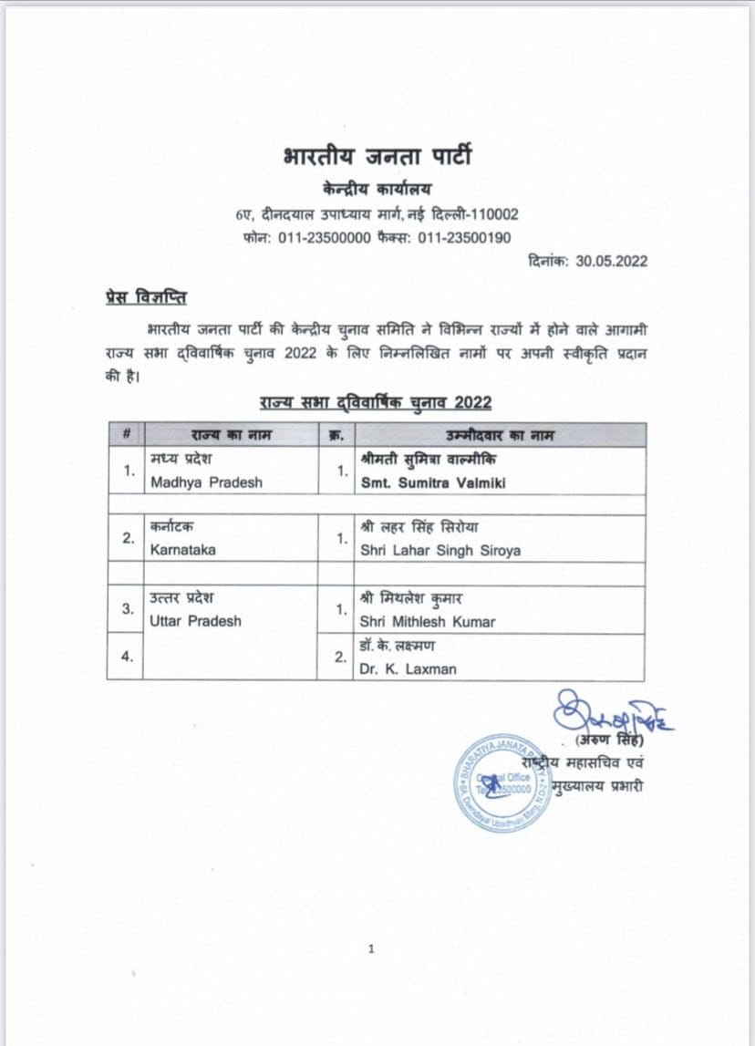 इसके अलावा सुमित्रा बाल्मीक एक बार नगर निगम अध्यक्ष भी रही हैं और फिर उसके बाद उन्हें भारतीय जनता पार्टी में प्रदेश उपाध्यक्ष का दायित्व सौंपा था, ऐसे में अचानक से ही उनका नाम राज्यसभा सांसद के लिए निर्वाचित होना यह भारतीय जनता पार्टी में गहमागहमी का माहौल बनाने वाला है, सुमित्रा बाल्मिक का नाम सामने आने के बाद ही उन्हें भारतीय जनता पार्टी के आलाकमान ने भोपाल बुलाया है जिसके बाद वह जबलपुर से भोपाल के लिए रवाना भी हो गई हैं, इधर उनके अचानक से ही राज्यसभा सांसद के नाम आने के भाजपा के वह बड़े नाम जो कि राज्यसभा में जाने की आस लगाए बैठे हुए थे वह है मायूस और निराश हो गए हैं।