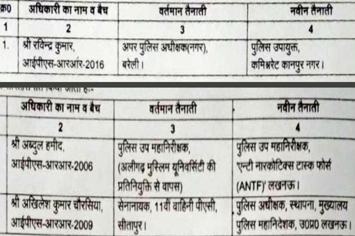 अलीगढ़ विश्वविद्यालय में तैनात रहे आईपीएस अब्दुल हमीद को डीआईजी एंटी नारकोटिक्स टास्क फोर्स लखनऊ की शाखा में भेजा गया है। जबकि बरेली में अपर पुलिस अध्यक्ष के पद पर तैनात रविंद्र कुमार को डीसीपी कानपुर पुलिस कलेक्ट्रेट में तैनात किया गया है।