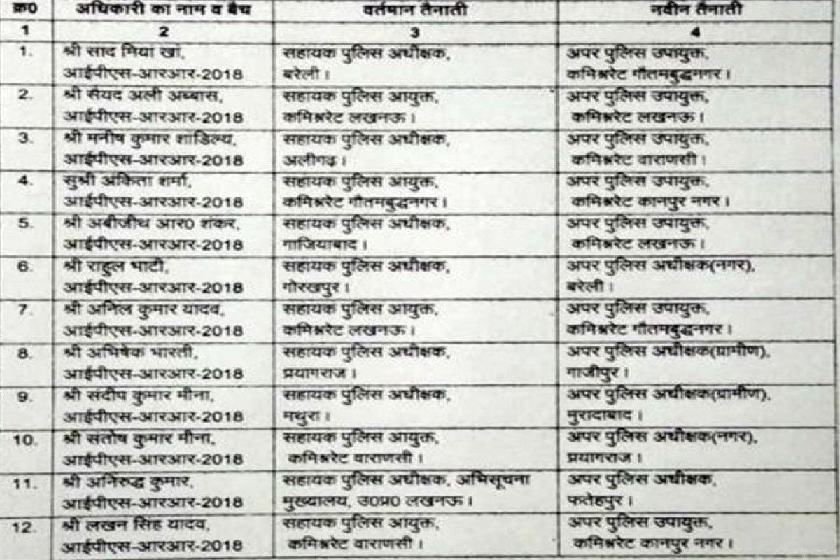 सहायक पुलिस अधीक्षक गाजियाबाद में तैनात अभिजीत आर शंकर को अप्पर पुलिस उपायुक्त कमिश्नर लखनऊ तैनात किया गया है। प्रयागराज में सहायक पुलिस अधीक्षक अभिषेक भारती को अपर पुलिस अधीक्षक ग्रामीण गाजीपुर तैनात किया गया है। जबकि मथुरा के सहायक पुलिस अधीक्षक संदीप कुमार मीणा को अपर पुलिस अधीक्षक गाजीपुर तैनात किया गया है। बनारस पुलिस कमिश्नरेट में तैनात लखन सिंह यादव को अपर पुलिस उपायुक्त कमिश्नरेट कानपुर तैनात किया गया है।
