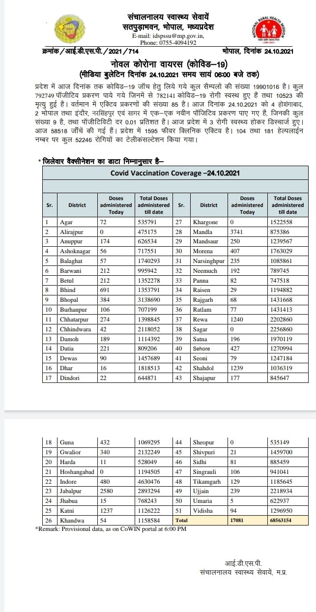 स्वास्थ्य विभाग (MP Health Department Report) की रिपोर्ट्स के अनुसार, प्रदेश में रविवार को 58 हजार 518 कोरोना जाँच की गईं। कुल 9 कोरोना के नए प्रकरण आए। इनमें से 2 भोपाल, 4 होशंगाबाद और इंदौर, नरसिंहपुर और सागर में एक-एक प्रकरण 24 अक्टूबर को पाए गए हैं। जबकि प्रदेश में 3 कोरोना रोगी स्वस्थ हाकर डिस्चार्ज हुए। शनिवार को 3 लाख 99 हजार 158 कोरोना वैक्सीन डोज लगाए गए। प्रदेश में अब तक 6 करोड़ 85 लाख एक हजार 813 वैक्सीन (corona vaccine) डोज लगायी जा चुकी हैं।