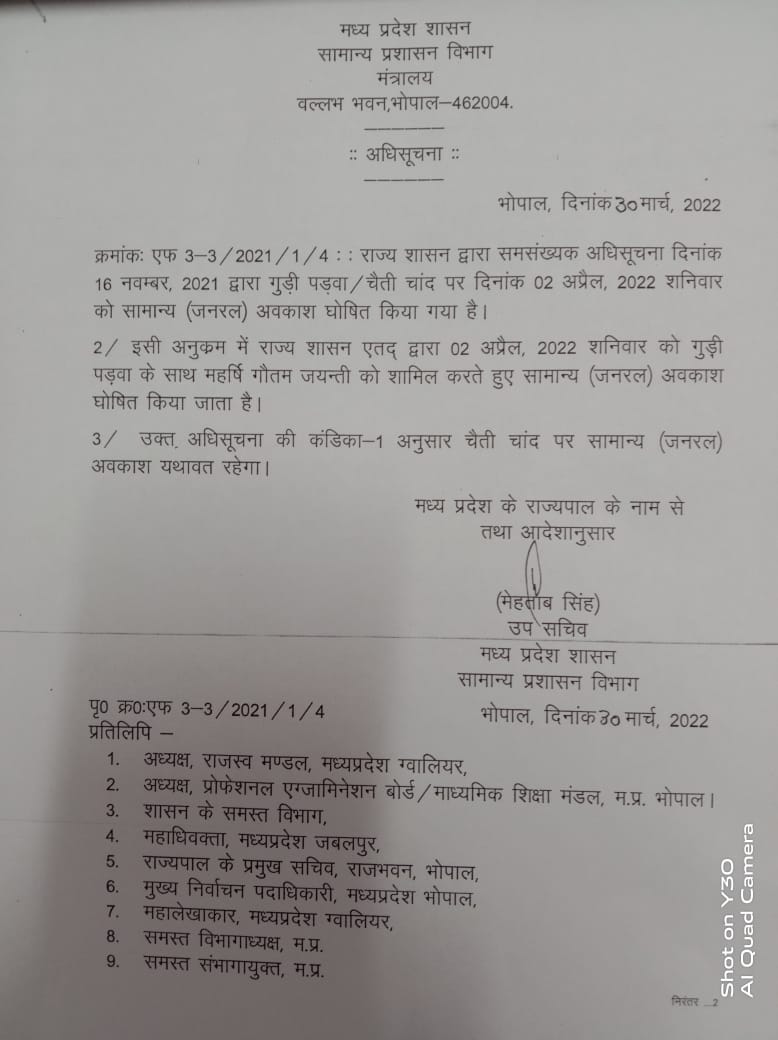 सामान्य प्रशासन विभाग (General Administration Department) द्वारा जारी आदेश के मुताबिक राज्य शासन 16 नवंबर 2021 द्वारा गुड़ी पड़वा चैती चांद पर दिनांक 2 अप्रैल शनिवार को सामान्य अवकाश घोषित किए जाने का ऐलान किया। इसके साथ ही राज्य शासन द्वारा 2 अप्रैल शनिवार को गुड़ी पड़वा के साथ महर्षि गौतम जयंती को भी शामिल करते हुए जनरल अवकाश घोषित किया गया है।