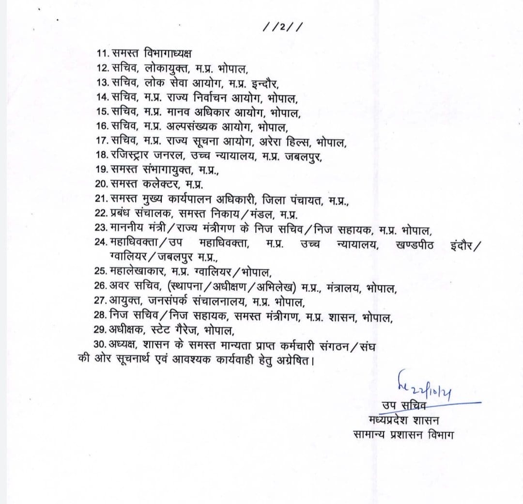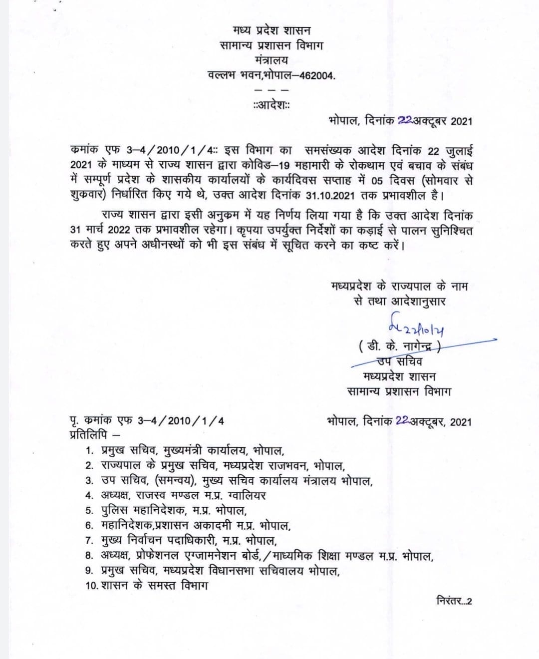 राज्य शासन द्वारा कोविड- 19 महामारी के रोकथाम एवं बचाव के लिए सम्पूर्ण प्रदेश के शासकीय कार्यालयों के कार्यदिवस सप्ताह में 5 दिवस (सोमवार से शुक्रवार) निर्धारित किए गये थे। राज्य शासन द्वारा यह निर्णय लिया गया है कि यह आदेश 31 मार्च 2022 तक प्रभावशील रहेगा।#GAD_MP pic.twitter.com/4KUNyNB49a