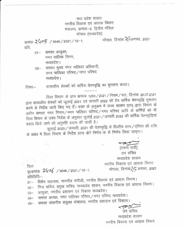 भोपाल, डेस्क रिपोर्ट। मध्यप्रदेश (MP) में कर्मचारी अधिकारियों (employees-officers) के लिए बड़ी खुशखबरी है। दरअसल सरकार ने वार्षिक वेतन वृद्धि (increment) के भुगतान को लेकर निर्देश जारी कर दिए हैं। इस संबंध में नगरीय विकास और आवास विभाग (Urban Development and Housing Department) ने कर्मचारियों को तीन बकाया वेतन वृद्धि के भुगतान के निर्देश दिए हैं।