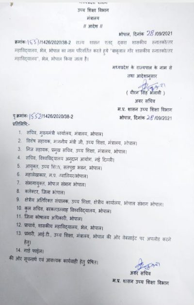 बता दें कि भोपाल के शासकीय स्नातकोत्तर कॉलेज BHEL का नाम अब बाबूलाल गौर शासकीय स्नातकोत्तर कॉलेज होगा। उच्च शिक्षा विभाग ने शासकीय स्नातकोत्तर कॉलेज BHEL के नाम को परिवर्तित किए हैं। विभाग द्वारा इस संबंध में आदेश जारी कर दिया गया है।