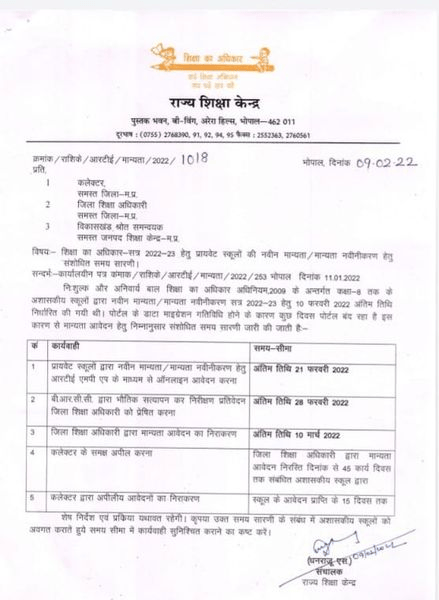 राज्य शिक्षा केंद्र द्वारा नि:शुल्क और अनिवार्य बाल शिक्षा का अधिकार अधिनियम 2009 के तहत कक्षा 8 तक के अशासकीय स्कूलों के लिए नवीन मान्यता और मान्यता नवीनीकरण की संशोधित समय सारणी जारी की है। संचालक राज्य शिक्षा केंद्र (state education center) धनराजू एस ने बताया कि इच्छुक अशासकीय विद्यालय मान्यता नवीनीकरण और नवीन मान्यता के आवेदन आरटीई एमपी ऐप के माध्यम से 21 फरवरी 2022 तक कर सकेंगे। इसके पूर्व 10 फरवरी 2022 आवेदन अंतिम तिथि निर्धारित की गई थी जिसे विद्यालयों की सुविधा के लिए बढ़ाया गया है।RTE एक्ट के अनुसार उपलब्ध मानकों की पूर्ति करने वाले अशासकीय स्कूल की मान्यता जिला शिक्षा अधिकारी द्वारा 3 वर्ष के लिये जारी की जायेगी।