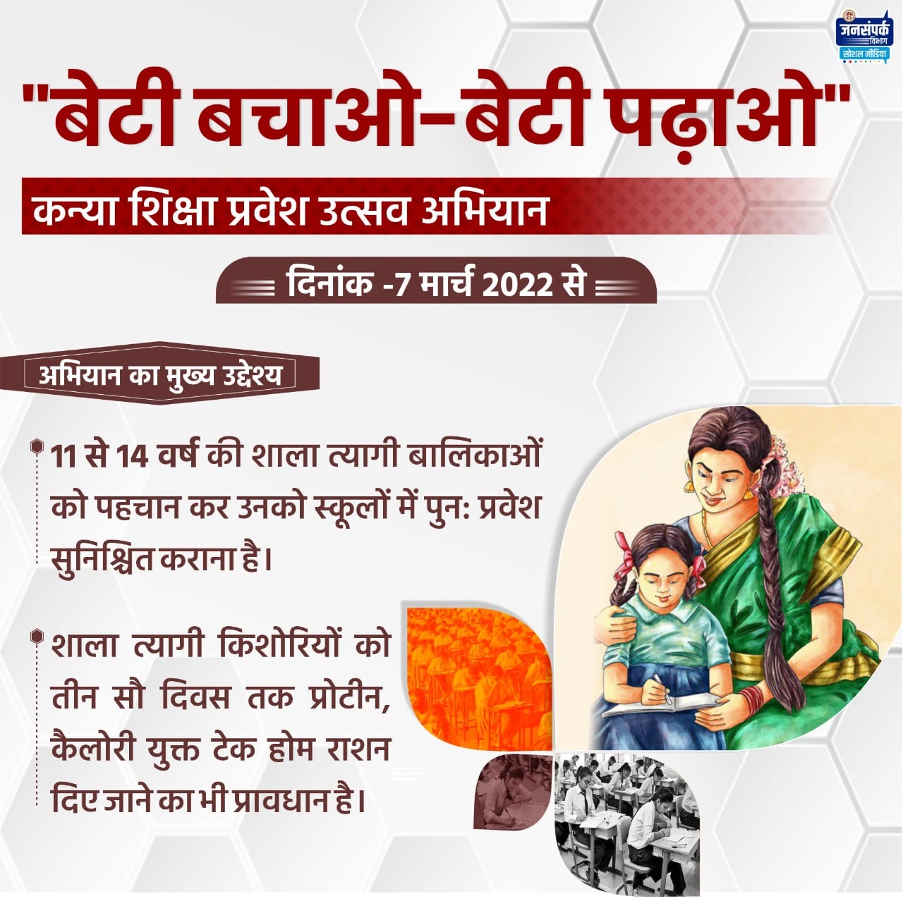 प्रदेश में शाला त्यागी बालिकाओं को पुन: अपनी शिक्षा नियमित करने के उद्देश्य से @mp_wcdmp द्वारा 7 मार्च से 'कन्या शिक्षा प्रवेश उत्सव' अभियान शुरू होगा। pic.twitter.com/GbZMi5d2aU— Jansampark MP (@JansamparkMP) March 6, 2022