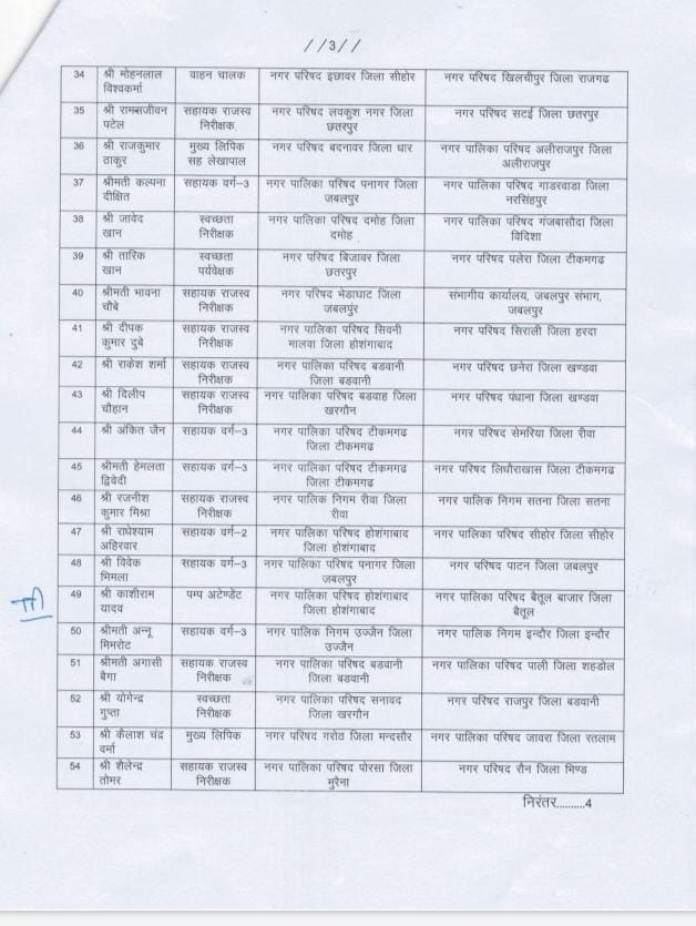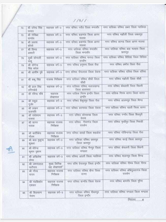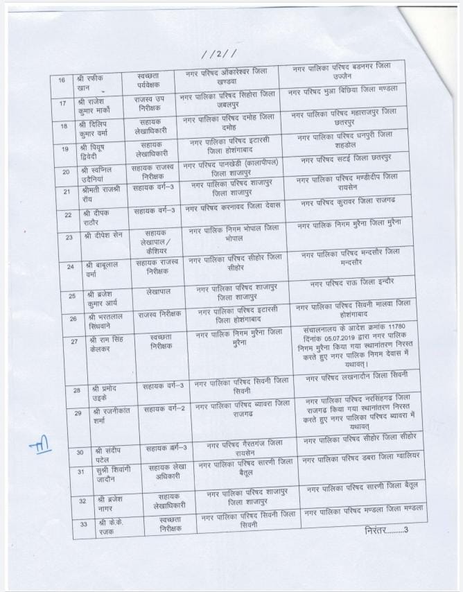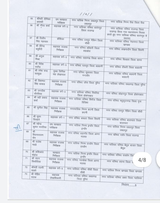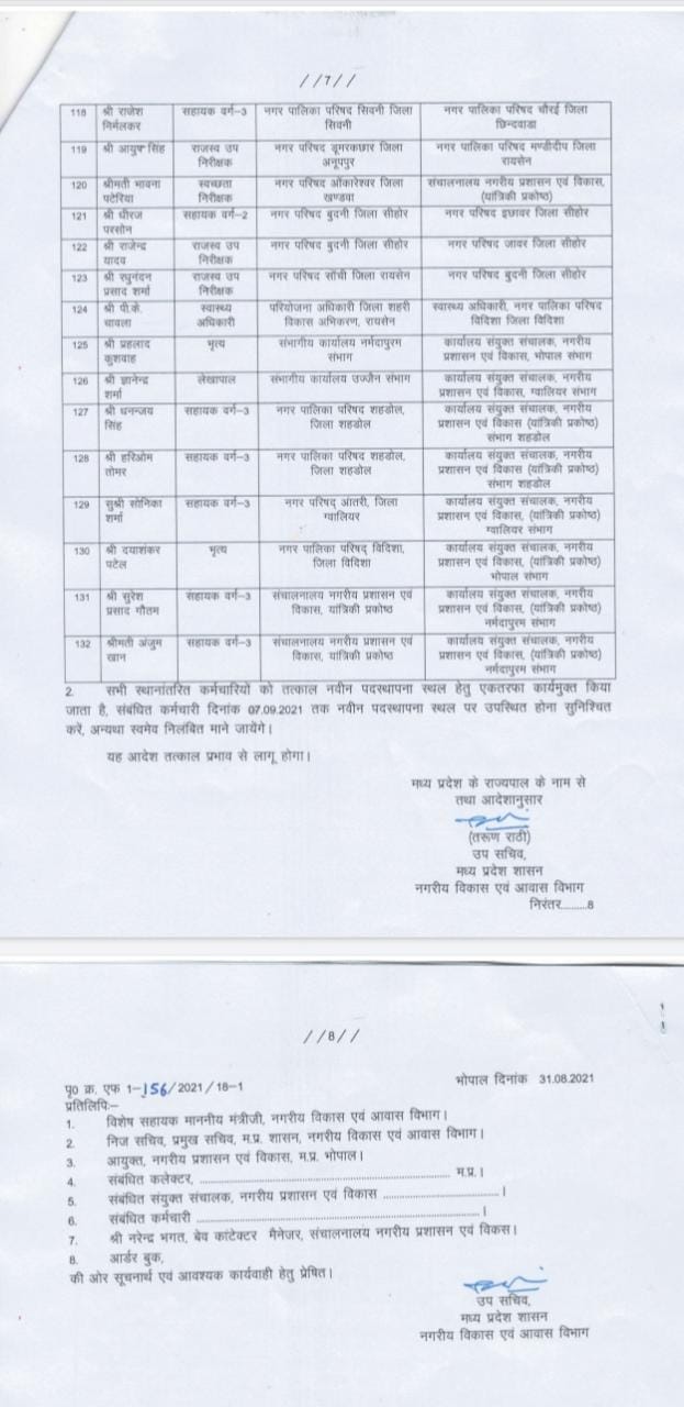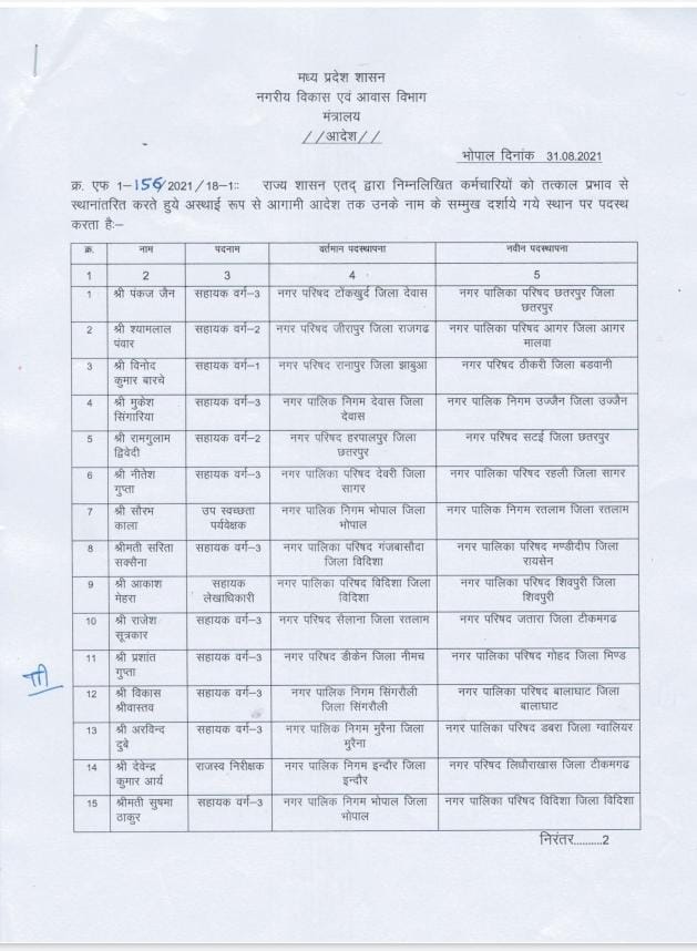 भोपाल, डेस्क रिपोर्ट। मध्य प्रदेश (MP) में 31 अगस्त तबादले (transfer) होने थे। जिसके बाद सामान्य नगरीय प्रशासन ने तबादला सूची (transfer list) जारी की गई है। जिसमें थोकबंद 132 कर्मचारियों को इधर से उधर किया गया है। यहां देखें लिस्ट