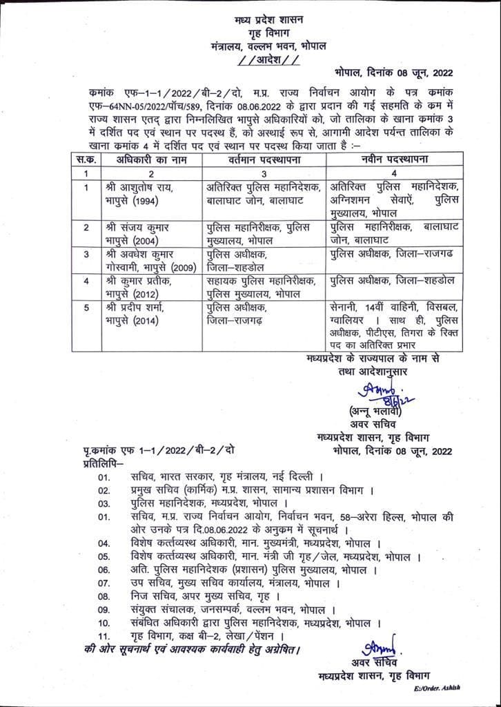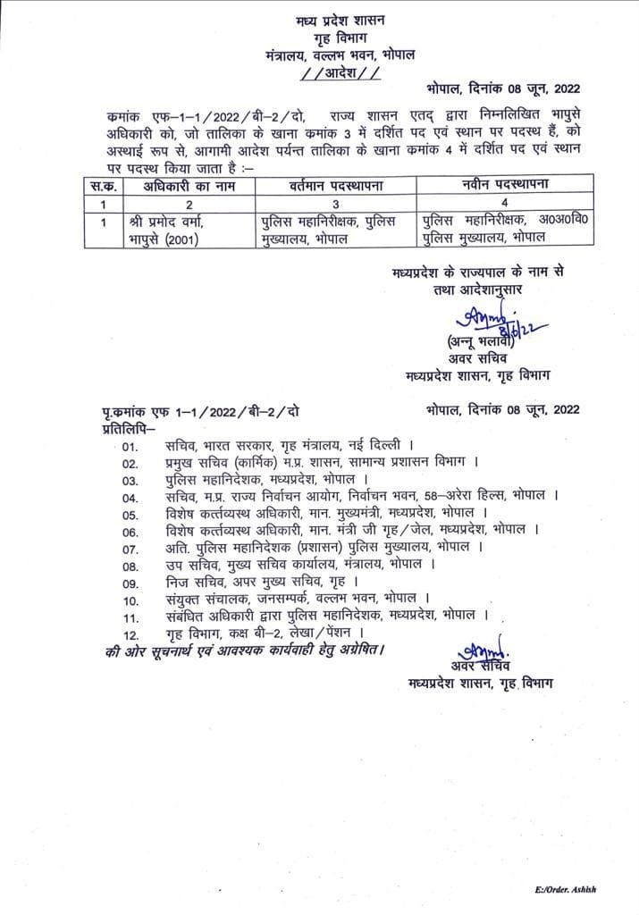 इसके अलावा IPS प्रमोद वर्मा पुलिस महानिरीक्षक भोपाल को नवीन पदस्थापना सबसे व पुलिस महानिरीक्षक, अ. अ.वि. पुलिस मुख्यालय भोपाल नियुक्त किया गया है